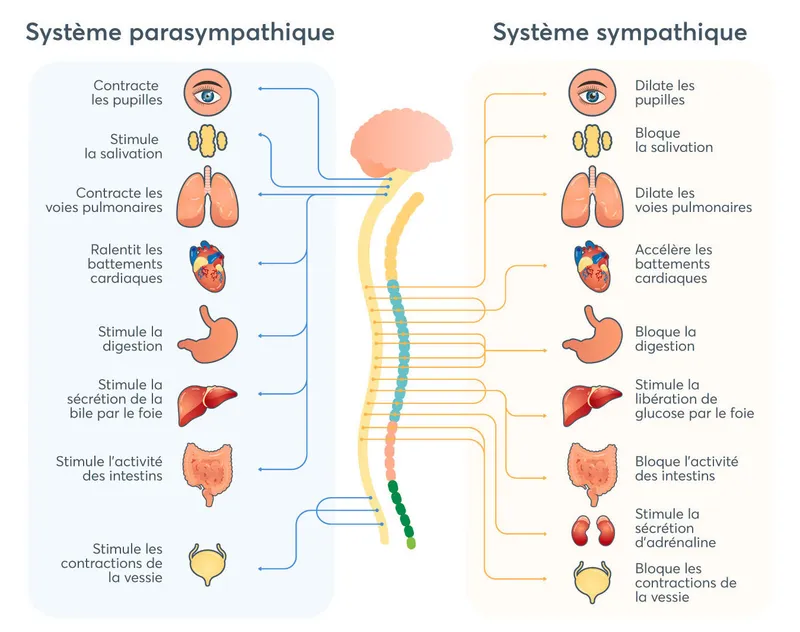 - le système nerveux parasympathique (SNP) : lié à la relaxation et à la digestion. Il est principalement représenté par le nerf vague.
